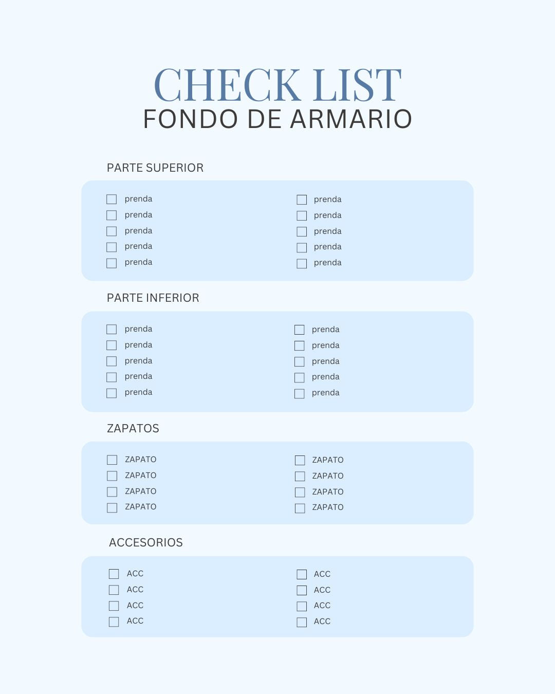 • Checklist de imprescindibles personalizados como prendas base que necesitas incorporar, prendas acento que aportan estilo, etc.